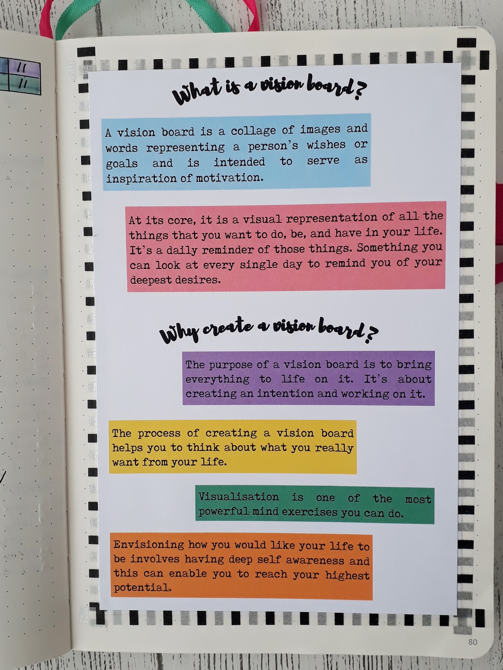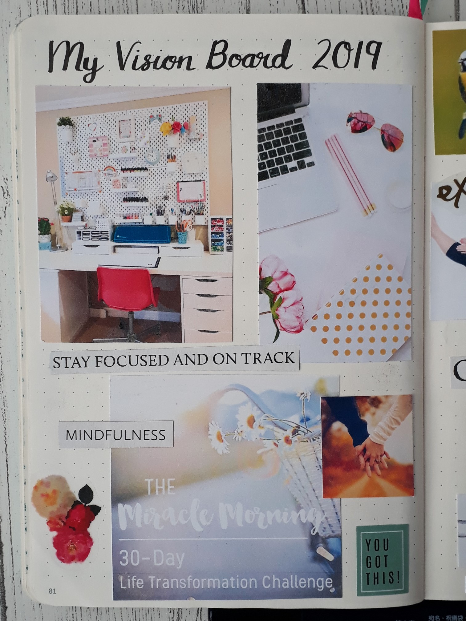 In 2018, my vision board was poster sized, tacked to the wall of my craft room and was very inspirational, when I looked at it (which I really, really did for at least a few months!!!). This year, I decided to put my vision board in my bujo and look at it every day as part of my Miracle Morning visualisation exercises. I also decided to get my images from Pinterest so that I wasn’t limited to magazine bits and pieces from my collection.