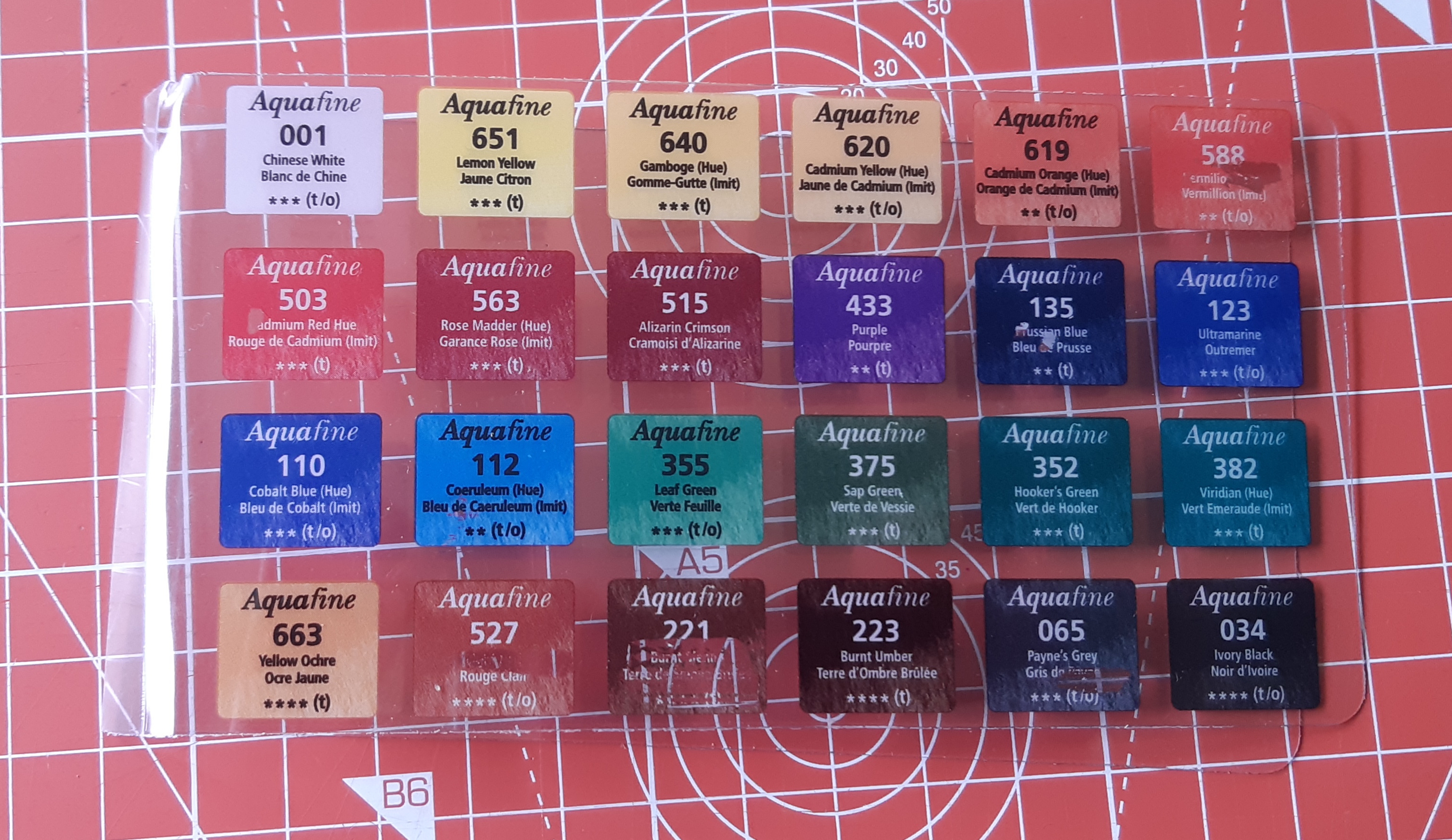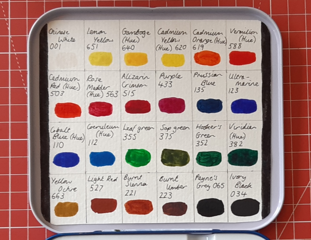 Before I start using them for projects, I decided to make a swatch of the colours to tape into the lid so I could see what each paint pan looked like on watercolour paper. I cut down an A4 sheet from a pad and then rounded the corners so it would fit nicely.
