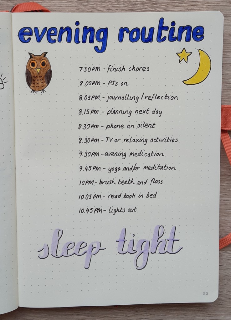 Obviously it takes weeks to establish a new routine but by writing it down, I think it reinforces your intention and makes you more likely to stick to it. You can also reflect on it as part of your evening journalling, for example, writing down that you woke up with a headache and detailing reasons why this might have happened, recording that you woke up feeling refreshed because you had a wonderful night’s sleep and why this might be the case.
