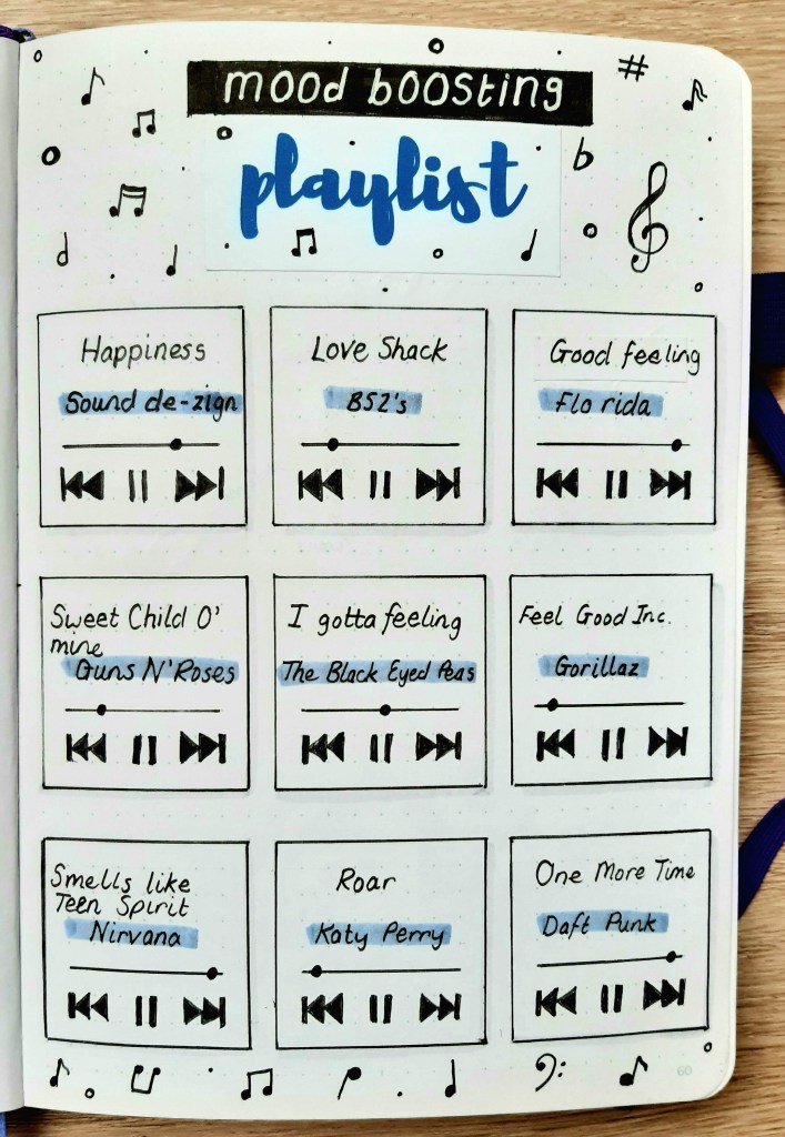 Making a playlist for times when you are feeling a little low or even depressed can be really useful. This can either be on your phone, your IPod or even in your bullet journal so you can seek out those songs on Spotify, YouTube or whatever is your music player of choice. Having them written down is particularly helpful for those times when you are struggling as, at that time, you may not be able to recall songs which are able to make you feel more upbeat.