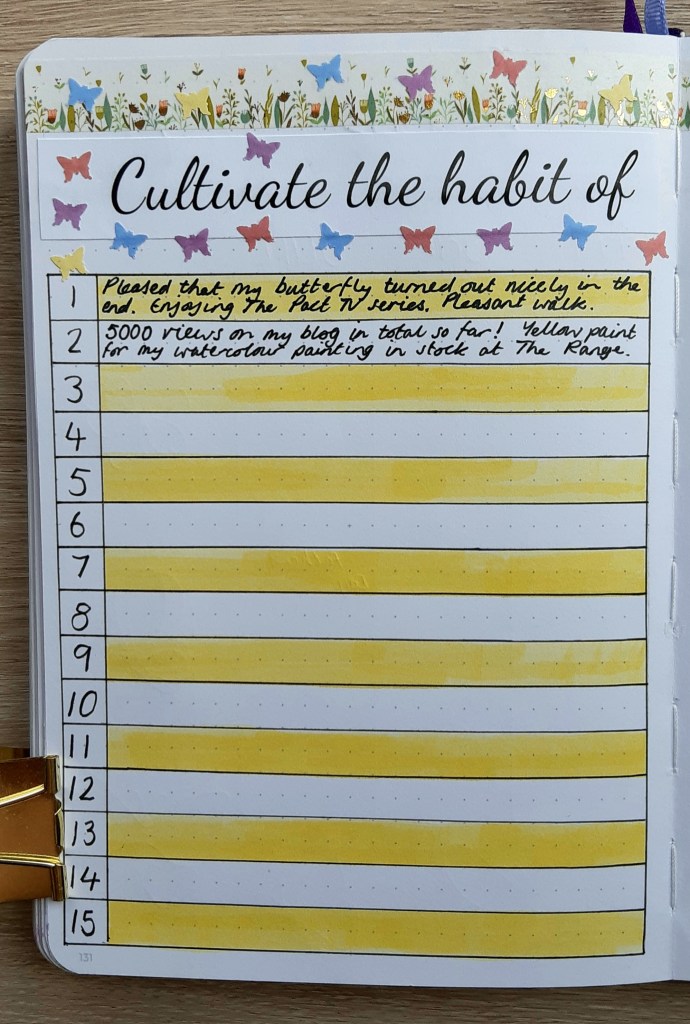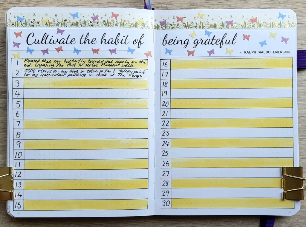 If you are a regular reader of my blog, you’ll know that I’ve been doing these gratitude pages for a while now. At the moment, I’m struggling with negativity due to various medical complaints impacting on my mental health and this means that finding things to be grateful for becomes a little more difficult but all the more useful. Sitting down and coming up with two or three things each night, reminds me that there are some good things to be thankful for. I’ve filled in the first two days to give you an idea of the kinds of things I write.