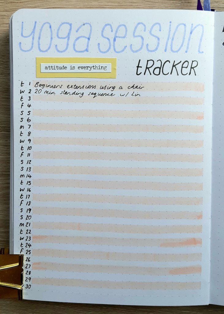 Another spread I’ve been doing for a while to record my daily yoga practice. I write down which YouTube yoga routine I’ve done so I can make sure I’m targeting different parts of the body and ensure that I’m not repeating sequences too often. I was keeping a yoga journal too but I seem to have got out of the habit of writing in there at the moment so this will do for now.
