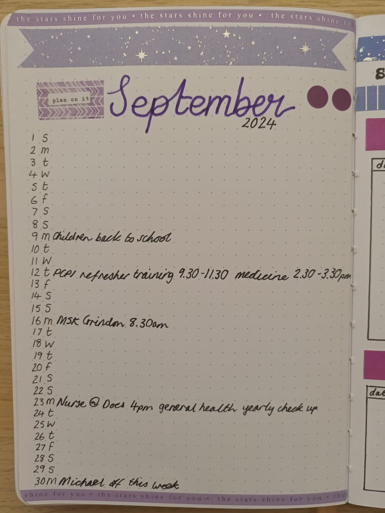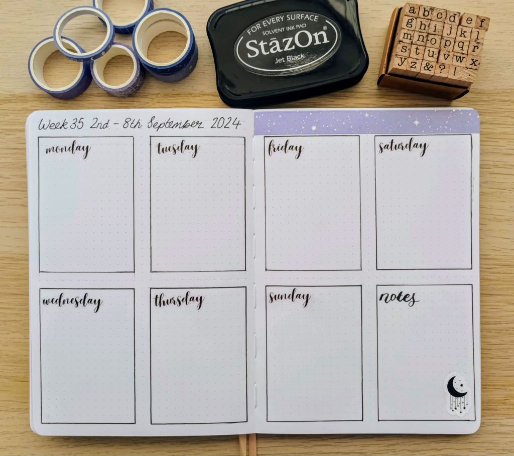 This has become my favourite layout for weekly spreads as it allows plenty of room for events and to dos. Sometimes, I’ll add decor at the bottom of the boxes and sometimes it’ll just be a long list of things I want to get done that day so I’ll skip the decor. Often, I’ll add more information or to do lists to the boxes as the days go by. Also, on a weekend, we might make last minute plans so I’ll write in what we got up to in retrospect. This helps me remember any days out so I can include photographs and text to my highlights journal when the month is over.