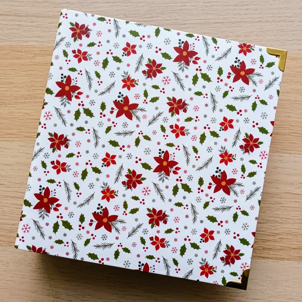 Before you embark on the project, think about what you might need to complete it. Doing the above should have helped but you might also want to sit down and create a list in preparation for purchasing items. For example, I decided I wanted to do a 6×8 album with some of the pages inside page protectors and some just reinforced with card. I also love the idea of lots of different layouts and photo sizes so I took this into consideration too, again making notes about my ideas. I ordered my album and page protectors pretty early on as when I looked at available options, I noticed some of the ones I liked were almost sold out as they had been released last year. I chose an Echo Park white album with poinsettias, holly, berries, snowflakes and spruce stems on and I still absolutely love it!
