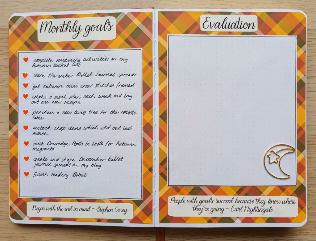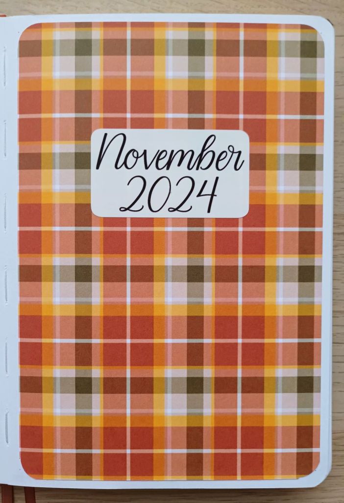 As I enjoyed doing my watercolour painting so much last month, I thought I’d give it a go with my front cover for this month. Again, I used cold-pressed watercolour paper but this time, it was from a new paper pad I picked up in Hobbycraft which has quite a pronounced grain to it. As my BuJo is getting very bulky, I needed to scan and print my finished art, but, although it doesn’t look exactly the same as the painted piece, it’s quite close, with the tree looking slightly paler. I also like the fact that you can see some of the grain in the sky. My inspiration for the background was from a photograph which I took early in the month, although I wish I’d had the photo in front of me when I did the sky as mine looks a bit bland in comparison! I opted for a dark brown tree and created a muddy grass ground effect using my fan brush, rather than painting snow.