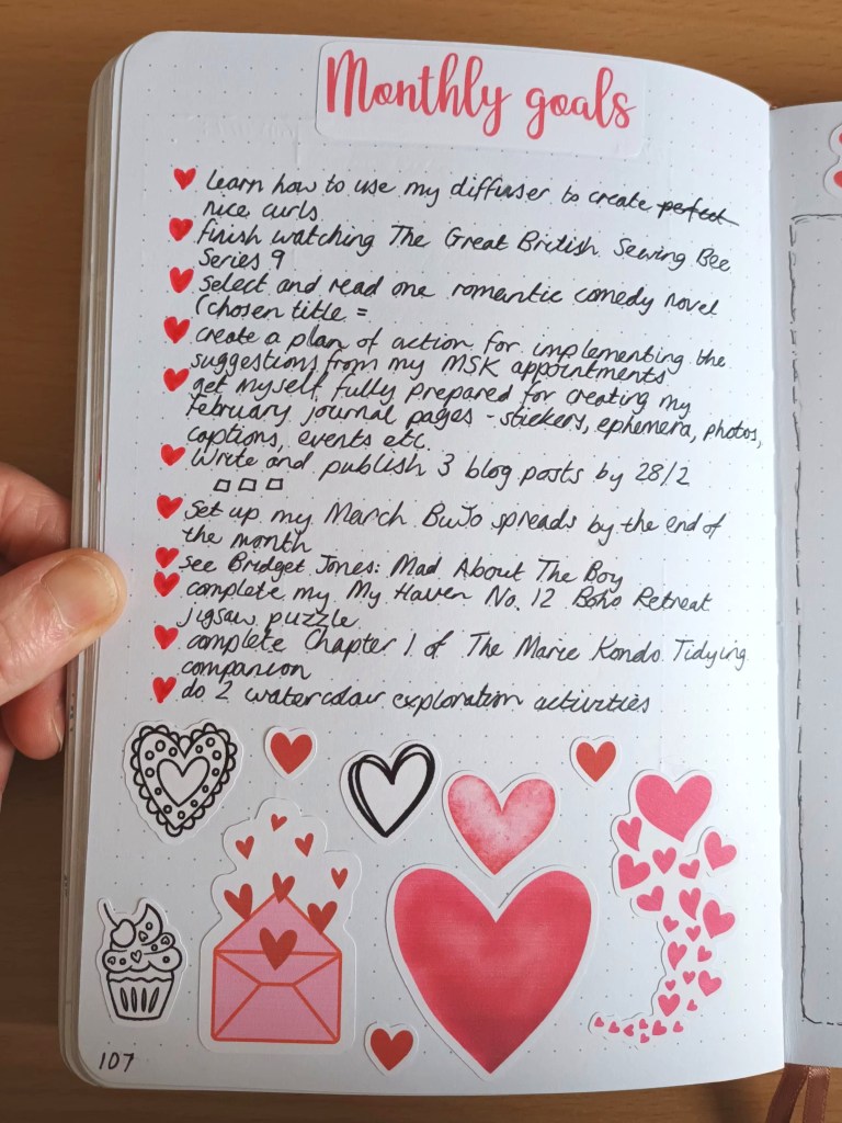 A goals page has become a regular feature in my monthly bullet journal pages. I look at my vision board for the year and also my bucket list to help me choose a small number of goals to work towards. When I first started adding goals, I would come up with around eight in total, but I soon discovered that this was too much and for the last few months, I chosen five which I feel is a lot more attainable, even if I’m busy with work and fitness classes.