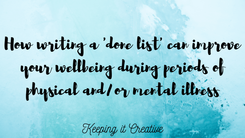Basically, I was busy thinking about how annoying it was that I was too exhausted to do anything and that being ill was a giant waste of time, and then I recalled that during my worst bipolar depressions, I still achieved a few things each day and tried my best to be kind to myself and celebrate small wins. To help me do this, I created something that I call a ‘done list’ and, although my illness was physical rather than mental on this occasion, I realised the same technique could be used to make myself feel better.