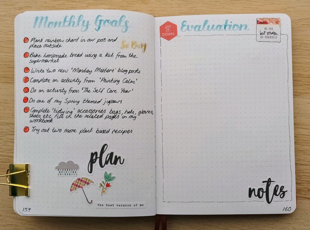 A goals page has become a regular feature in my monthly bullet journal pages. I look at my vision board for the year and also my bucket list to help me choose a small number of goals to work towards. When I first started adding goals, I would come up with around eight in total, but I soon discovered that this was too much and for the last few months, I chosen five which I feel is a lot more attainable, even if I’m busy with work and fitness classes.