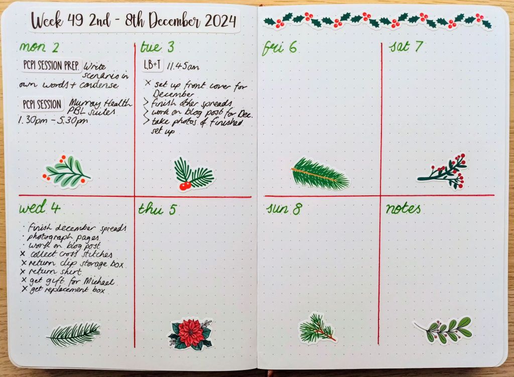 I’ve been using this same style layout for quite a few weeks now and it really works for me. It gives me enough room to write events and add a few to dos underneath each day. I can then add a small illustration at the bottom if I want to, or use the full space for recording. This week, I’ve done some small primrose illustrations but I may not do any next week as I have lots of sessions at the university so I’ll be super busy.